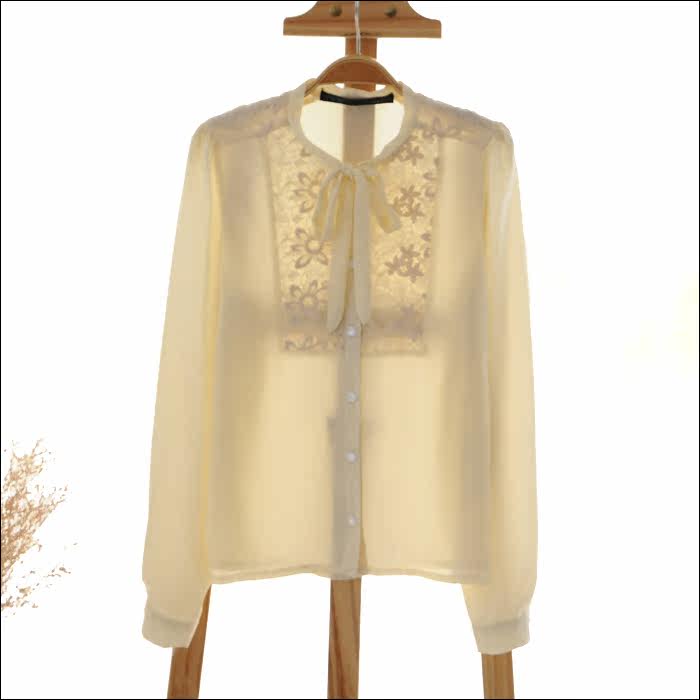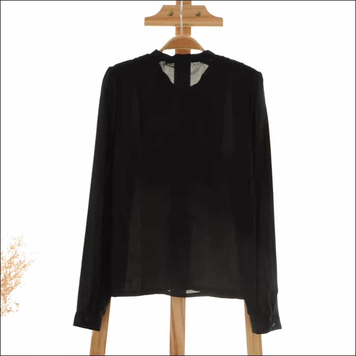 [พร้อมส่ง] [เสื้อ] [Qi-112] Qian Qian++เสื้อ++เสื้อสีดำซีฟองแขนยาวคอผูกลายลูกไม้