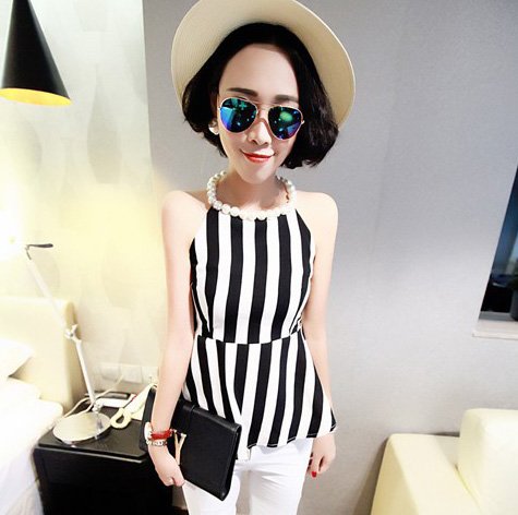 [[พร้อมส่ง]] [Wu-085] Wu++เสื้อ++เสื้อลายทางขาวดำคล้องคอสายมุข
