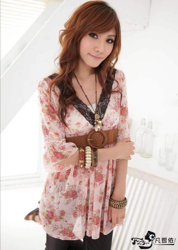 [[พร้อมส่ง F]][Yi-920] FZY++เสื้อ++เสื้อสีชมพูผ้าซีฟอง ลายดอกไม้ แขนยาว คอวีแต่งด้วยผ้าลูกไม้ ใต้อกยืดได้ค่ะ