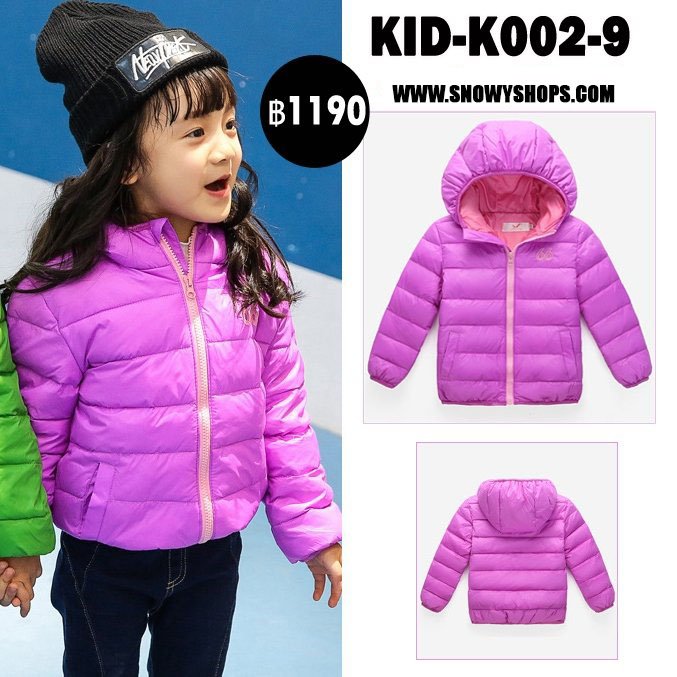 [พร้อมส่ง] [KID-K002-9] เสื้อโค้ทขนเป็ดเด็กสีม่วง มีหมวกฮู้ด เป็นโค้ทสั้นซับขนใส่กันหนาว กันฝน ลุยหิมะได้ค่ะ